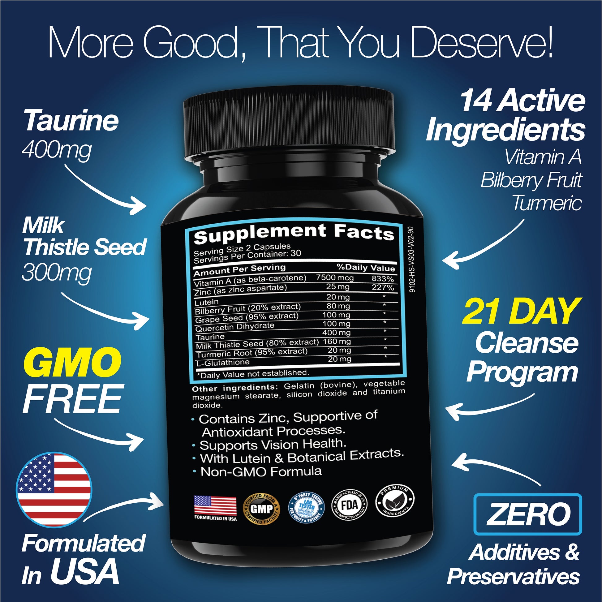Vitamin A 7500mcg, Zinc 25mg, Lutein 20mg, Bilberry Fruit 80mg, Grape Seed 100mg, Quercetin Dihydrate 100mg, Taurin 400mg, Milk Thistle Seed 160mg, Turmeric Root 20mg, L-Glutathione 20mg